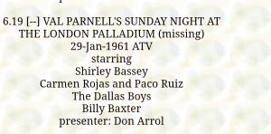 Sunday Night at The London Palladium was the biggest entertainment show of the decade. Watched by millions, appearing on such a show was such a prestige moment for any performer and often helped record sales as DSB witnessed with As I love you and Kiss me honey honey a few years back in the late 50s. This performance is the only surviving footage around. Recorded from a TV live at the time on a reel to reel tape recorder and when I received this, I cleaned the sound . DSB sounds amazing so sit back and enjoy ” early Shirley ”